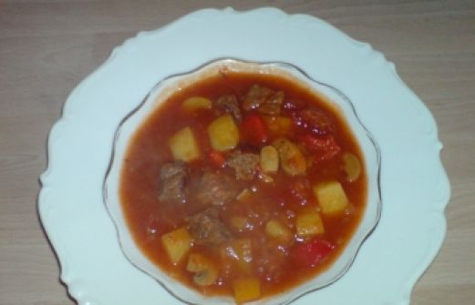 Zutaten für Personen Bild einstellen 1 kg Rindergulasch 1 kg Zwiebeln 1 Liter Brühe 1 Dose Tomaten 2 Paprikas 1 Glas Champignons 4 große Kartoffeln 2 Eßl. Tomatenmark 1 Peperoni Salz, Pfeffer und Paprika e [...]