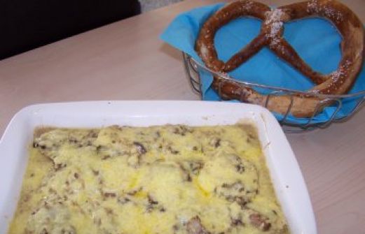 Zutaten für Personen Rezept mit Bild: Bayerischer Knödel-Wurst-Auflauf Bild einstellen 6 Semmelknödel 250 gr. Champignons 1 Zwiebel 4 EL Butter 2 EL Mehl 500 ml Brühe instant Salz Pfe [...]