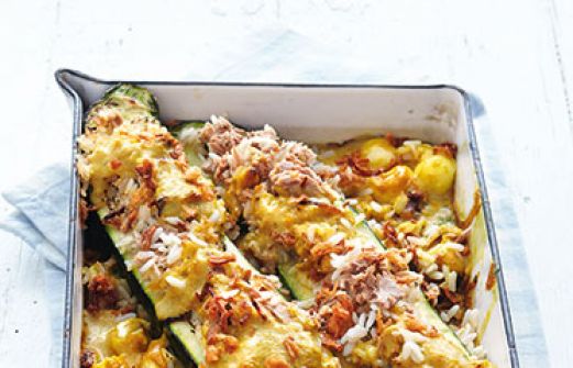 Zucchini mit Thunfisch-Reis Zutaten 2 Kochbeutel 10-Minuten-Reis (à 125 g) Salz 2 große Zucchini (à ca. 400 g) 2 EL Butter 1 1/2 EL Mehl 1 EL Currypulver 150 ml Gemüsebrühe 150 ml Milch Pfeffer 1 Dose Thunfisch im eigenen Saft (ca. 140 g Abtropfgewicht) 2 EL TK-Schnittlau [...]