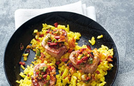 Schweinemedaillons im Reisbett Zutaten 1 Bund Frühlingszwiebeln 75 g Chorizo (ersatzweise Kabanossi) 1 EL Olivenöl 1/2 l Fleischbrühe 250 g Paella-Reis (ersatzweise Rissotto-Reis) 1 Döschen gemahlener Safran 1 Scheibe Toastbrot Salz Pfeffer 1 Schweinefilet (500-600 g) bre [...]
