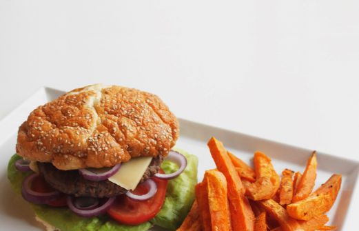 You need (1 Burger mit 1 Portion Süßkartoffelpommes): 1 Eigelb, 3 Eiklar, 1 EL Kräuterquark light, 150g Tatar (variabel dazu kannst du auch Hähnchenbrust oder eine vegetarische "Bulette" verwenden), 1TL Sesam, 1/2 rote Zwiebel, 1 große Tomate, ein paar Salatblätter, bei Bedarf 1 Scheibe Lightkä [...]