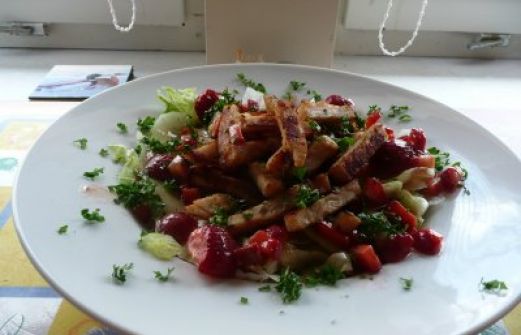 Zutaten für Personen Rezept mit Bild: Salate: Eisbergsalat mit Erdbeer- Himbeerdressing und Hähnchenstreifen Bild einstellen 1 Eisbergsalat frisch 150 g Erdbeeren frisch 1 Salatgurke 4 EL Himbeeressig 4 E [...]