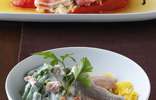 Matjesfilet mit Bohnensauce Zutaten 200 g kleine Kartoffeln Salz 150 g junge grüne Bohnen 1 Schalotte 1 Scheibe roher Schinken (z. B. Katenschinken) 2 TL Butter 50 g Sahne 100 ml Milch (1,5 % Fett) 2 TL Magermilchpulver weißer Pfeffer 2 Matjesfilets à ca. 60 g 1 EL geha [...]