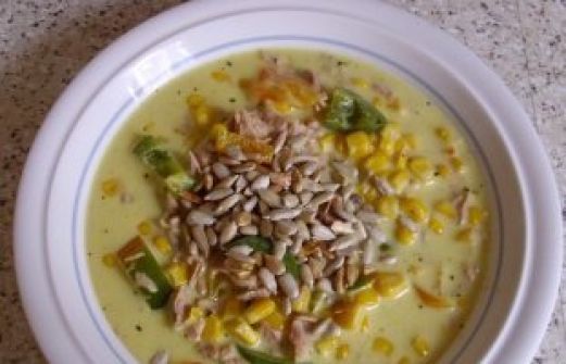 Zutaten für Personen Rezept mit Bild: Maissuppe Bild einstellen 1 Zwiebel 1 grüne Paprika 1 Dose Gemüsemais 250 ml Brühe 1 Becher Cremefine 1 Dose Thunfisch Currypulver, Sonnenblumenkerne, Butter [...]