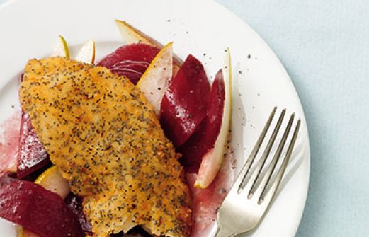 Mohn-Fisch mit Rote-Bete-Salat Zutaten 3-5 TK-Rotbarsch-Naturfilets (ca. 360 g) Salz Pfeffer 2 EL Weißweinessig 1 TL flüssiger Honig 4 EL Rapsöl 400 g gekochte Rote Bete (vakuumverpackt) 1 reife Birne (ca. 170 g) 80 g Mehl 8ß g Semmelbrösel 2 EL Mohnsamen 2 Eier (Größe [...]