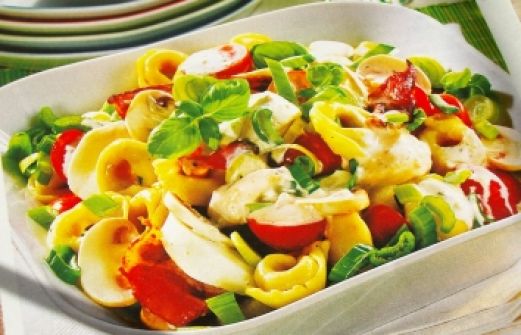 Zutaten für Personen Bild einstellen 150 g getrocknete Tortellini Salz, weißer Pfeffer 5 Scheiben Frühstücksspeck 3-4 EL Essig 1 Prise Zucker, 2-3 EL Öl 100 g Kirschtomaten 1/2 Bund Lauchzwiebeln 60 g Champ [...]