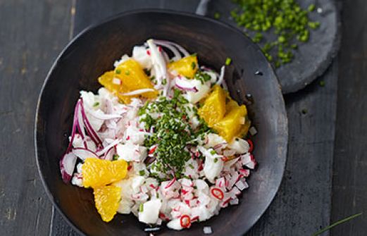 Dorsch-Ceviche mit Radieschen Zutaten 400 g Dorschfilet (ohne Haut, z. B. Angeldorsch aus der Ostsee) 2 Limetten 1-2 Orangen Salz 1 rote Zwiebel 1 rote Chilischote 5-6 Radieschen 1 Bund Schnittlauch 400 g Dorschfilet (ohne Haut, z. B. Angeldorsch aus der Ostsee) , [...]
