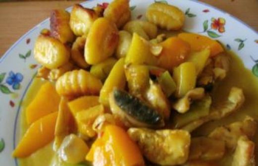 Zutaten für Personen Rezept mit Bild: Putencurry mit Pfirsich Bild einstellen 2 Putenfilets 1 Zucchini 5 Champignons frisch 2 Lauchzwiebeln frisch 2 Knoblauchzehen 1 Stück Ingwer 500 ml K [...]