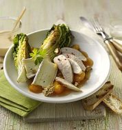 Erbsen mit Salatherzen Zutaten 400 g TK-Erbsen 2 Römersalatherzen 2 Schalotten 2 EL Butter 100 ml Gemüsebrühe 80 g Sahne Salz Pfeffer frisch geriebene Muskatnuss 1 Zweig Estragon 1-2 TL frisch gepresster Zitronensaft Zucker 400 g TK-Erbsen , 2 Römersal [...]