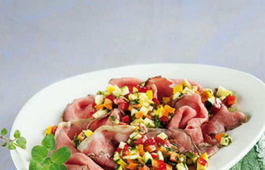 Roastbeef mit Gemüsevinaigrette Zutaten 1 Päckchen TK-Kräuter (z.B. italienische Mischung) Salz schwarzer Pfeffer aus der Mühle 1 TL Meerrettich (frisch gerieben oder aus dem Glas) 3 EL Aceto balsamico 2 EL Olivenöl 4 EL Gemüsebrühe 250 g Gemüse (z.B. Paprika und Zucchini) 200 [...]