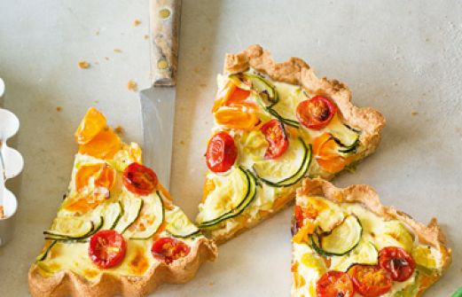 Gemüse-Quiche Zutaten 250 g Dinkel-Vollkornmehl Salz 1 Ei (M) 150 g Butter, 3 Möhren 1 Stange Lauch 250 g Kirschtomaten 2 kleine Zucchini 200 g Crème fraîche 100 g Naturjoghurt 2 Eier (M) Pfeffer Cayennepfeffer 1 Quicheform (30 cm Ø) Fett für die Form Mehl zum Arbei [...]