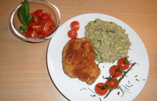 Zutaten für Personen Rezept mit Bild: Dicke Bohnen mit fein paniertem Putenschnitzel Bild einstellen 1 Glas Dicke Bohnen 2 Stück Putenschnitzel 150 g Speck 1 Ei 1 Zwiebel Bohnenkraut Gewürz [...]