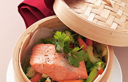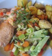 Gedämpfter Lachs auf Gemüse Zutaten 1 Knoblauchzehe 1 Möhre 2 Stangen Lauch 1 Stange Staudensellerie 1/4 Brokkoli (ca. 100 g) 1 Bund Petersilie 1 EL Petersilie Salz schwarzer Pfeffer 500 ml Gemüsebrühe 2 Lachsfilets (ca. 250 g) 1 Knoblauchzehe , 1 Möhre , [...]