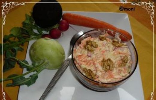 Zutaten für Personen Rezept mit Bild: Möhrensalat und verschiedenes Gemüse Bild einstellen 3 Möhren 1 Kohlrabi 1 Apfel 0.5 schwarzen Rettich 0.5 Bund Radieschen 100 gr. griechischen Joghurt 75 gr. [...]