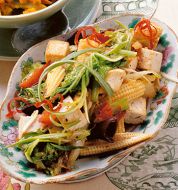 Portionen : 40 2 Knoblauchzehen 2 (400 g)-Dosen Kichererbsen, abgetropft 225 g Tofu 3 Zitronen, ausgepresst 1/2 Bund Petersilie 175 g Tahini 1 TL gemahlener Ingwer 1 Prise Cayennepfeffer 1 EL Sojasauce Salz frisch gemahlener schwarzer Pfeffer Zub.: 10 [...]
