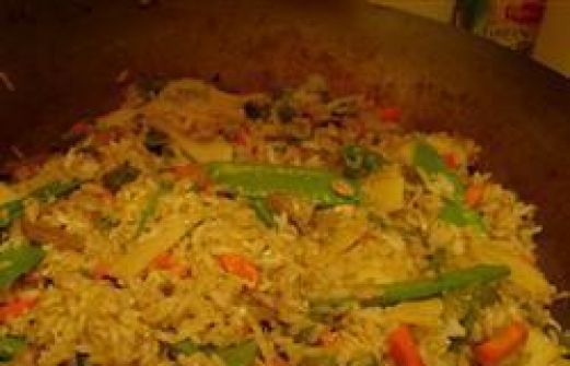 Portionen : 8 275 g Langkornreis 750 ml Wasser 1 EL + 1 EL Pflanzenöl 1/2 Zwiebel, gehackt 1 Knoblauchzehe, fein gehackt 5 Eier, verschlagen 1 EL + 3 EL Sojasauce 2 Stangen Sellerie, in dünne Scheiben geschnitten 100 g Pilze, in Scheiben geschnitten 1 grüne Papr [...]