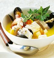 Portionen : 4 150 g Zwiebeln 150 g Möhren 2 Stangen Sellerie 350 g kleine neue Kartoffeln 1 EL natives Olivenöl extra 1 Knoblauchzehe 125 ml trockener Weißwein 300 ml Fischfond 10–12 Safranfäden 500 g Fischfilet (Kabeljau oder Lachs) 150 g grüne Bohnen 125 [...]