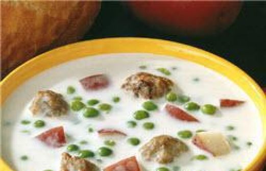 Portionen : 4 1 Brötchen vom Vortag 1 Tasse Milch 500 g kleine neue Kartoffeln 600 ml Fleischbrühe 1 Zwiebel 500 g Rinderhackfleisch 1 EL fein gehackte Petersilie 1 Ei (Gewichtsklasse M) Salz, Pfeffer 1 EL Butter 300 g tiefgekühlte Erbsen 200 g Schlagsahne [...]