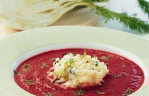 Portionen : 4 1 Zwiebel 500 g Rote Bete 1 große Möhre 1 Fenchelknolle (etwa 200 g) 1/2 TL Zitronensaft 1 EL natives Olivenöl extra 1 l Gemüsebrühe 800 g mehligkochende Kartoffeln 2 Frühlingszwiebeln Salz, Pfeffer 125 ml Milch 4 EL Naturjoghurt Zub.: [...]