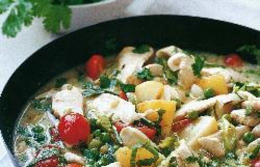 Portionen : 4 600 g Hähnchenbrustfilet 400 g kleine neue Kartoffeln 400 ml Kokosmilch 200 ml Geflügelbrühe 2 EL grüne Thai-Currypaste 125 g tiefgekühlte Erbsen 6 Frühlingszwiebeln 8 Kirschtomaten 2 EL Limettensaft Salz, Pfeffer 4 EL fein gehackter Koriander [...]