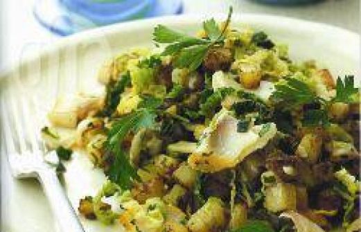 Portionen : 4 1 kg mehligkochende Kartoffeln 2 EL Sonnenblumenöl Salz schwarzer Pfeffer aus der Mühle 4 Frühlingszwiebeln 1/2 Wirsing (etwa 250 g) 300 g geräucherter Heilbutt oder Schillerlocken 1 EL fein gehackte Petersilie Zub.: 12 Min. | Kochzeit: 25 M [...]