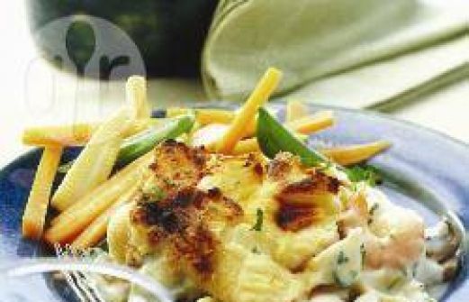 Portionen : 4 600 g mehligkochende Kartoffeln 50 g Frischkäse 1 kleine Zwiebel 500 g Fischfilet, z. B. Kabeljau 1 EL Butter plus Butter für die Form 500 ml Milch 2 Lorbeerblätter 4 Stängel Petersilie 100 g kleine Muschelnudeln 100 g Champignons 3 EL Mehl 1 [...]
