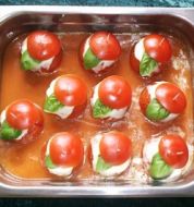 Zusätzlich zum Salat wollte ich noch eine Gemüse-Komponente haben. Nach einigem hin und her habe ich mich dann für gefüllte Tomaten entschieden. Und damit sie auch unter Fingerfood fallen, habe ich kleine Rispen-Tomaten gefüllt :)