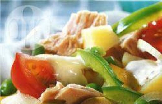Portionen : 4 150 g TK-Erbsen 150 g grüne TK-Bohnen Salz 3 Pellkartoffeln vom Vortag (fest kochende Sorte) je 1 gelbe und grüne Paprikaschote 1 weiße Zwiebel 2 Tomaten 100 g grüne Oliven mit Paprikafüllung 200 g Thunfisch (aus der Dose, in Lake) 1 kleine Knoblau [...]