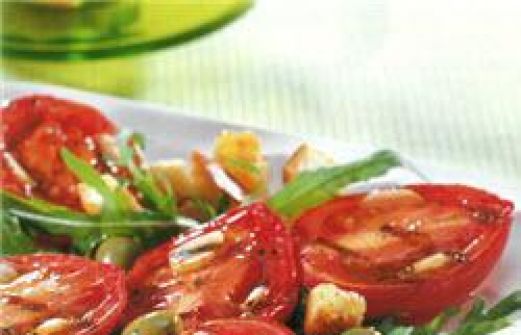 Portionen : 4 4 dicke Scheiben Baguette 5 EL Olivenöl 10 Eiertomaten 2 Knoblauchzehen 150 g Rucola 1 EL Aceto balsamico 1 EL Zitronensaft Salz schwarzer Pfeffer aus der Mühle 100 g entsteinte grüne Oliven Zub.: 15 Min. | Kochzeit: 15 Min. 1. D [...]