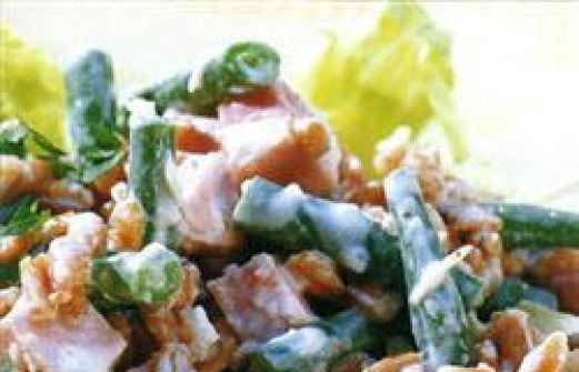 Portionen : 4 200 g parboiled Weizen 400 ml Gemüsebrühe 400 g grüne Bohnen Salz 250 g Wacholderschinken 1 kleiner Eissalat 2 EL Crème fraîche 100 g Schlagsahne 1/2–1 EL geriebener Meerrettich 2 EL Weißweinessig schwarzer Pfeffer aus der Mühle 1/2 Bund glat [...]
