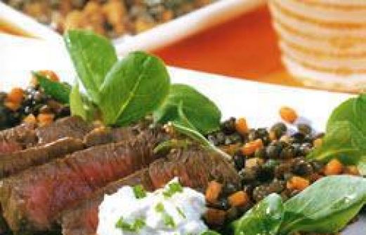 Portionen : 4 1 EL körniger Senf (z.B. aus Meaux) 6 EL Olivenöl schwarzer Pfeffer aus der Mühle 2 Rindersteaks 200 g Puy-Linsen 1 kleiner Zweig frischer Rosmarin 300 ml Kalbsfond 2 Möhren Salz 100 g Feldsalat 2–3 EL Rotweinessig 3 Zweige frischer Thymian [...]