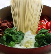 Portionen : 8 1 (500 g)-Packung Penne oder andere Nudeln 8 mittelgroße Tomaten, gewürfelt 4 EL natives Olivenöl 3-4 EL gehacktes frisches Basilikum 1/4 rote Zwiebel, fein gehackt frisch geriebener Parmesan Salz schwarzer Pfeffer aus der Mühle Zub.: 15 Min. | [...]