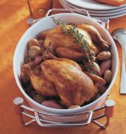 Portionen : 4 4 Stubenküken 1 + 2 EL Olivenöl Salz frisch gemahlener schwarzer Pfeffer 1 Zitrone, geviertelt 4 Zweige frischer Rosmarin 24 Knoblauchzehen 5 EL Weißwein 5 EL Hühnerbrühe 4 Zweige frischer Rosmarin zum Garnieren Zub.: 20 Min. | Kochzeit: [...]