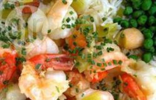 Portionen : 2 100 ml trockener Weißwein 200 ml Gemüsebrühe 1 TL frisch geriebener Ingwer 1 Knoblauchzehe, fein gehackt 1 kleine Karotte, geschält und in Scheiben geschnitten 1/2 Stange Lauch, geschält und in Scheiben geschnitten 10 frische Jakobsmuscheln 150 g Rieseng [...]