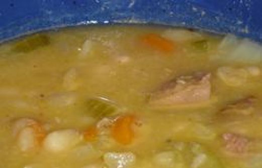 Portionen : 6 1 (500 g)-Packung getrocknete weiße Bohnen, über Nacht eingeweicht 3,5 l Wasser 1 Schweinshaxe mit Fleisch vom Vortag 1 Zwiebel, sehr fein gewürfelt 2 Karotten, gewürfelt 2 Stangen Sellerie, gewürfelt 1 Knoblauchzehe, gehackt 1/4 TL frisch gemahlener sch [...]