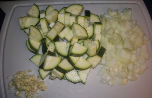 Zuerst würfelt man eine Zwiebel und schneidet eine Zucchino in Scheiben, die man dann viertelt. Außerdem h [...]
