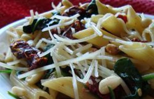 Portionen : 4 225 ml Gemüsebrühe 15 sonnengetrocknete Tomaten ½ (500 g)-Packung Penne 2 EL Pinienkerne 1 EL Olivenöl ¼ TL zerstoßene getrocknete Chilischote 1 Knoblauchzehe, fein gehackt 1 Bund frischer Spinat, gewaschen und in mundgerechte Stücke gezupft Frisch ge [...]