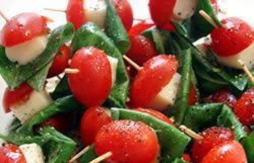 Portionen : 8 20 Kirschtomaten, halbiert 20 frische Basilikumblätter 20 kleine Büffelmozzarella-Kugeln Salz Pfeffer aus der Mühle 100 ml Balsamessig 4 EL natives Olivenöl 20 Holzstäbchen Zub.: 20 Min. 1. Auf ein Holzstäbchen je eine Tomatenhälfte, eine Mo [...]