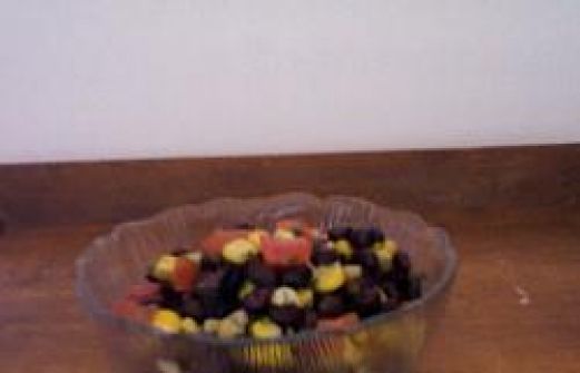 Portionen : 6 3 (400 g)-Dosen schwarze Bohnen, abgespült und abgetropft 4 (340 g)-Dosen Gemüsemais, abgetropft 1/2 rote Zwiebel, gewürfelt 2 grüne Paprikaschoten, gewürfelt 200 g eingelegte rote Paprika, abgetropft und gewürfelt 5 EL Rotweinessig 5 EL Olivenöl Zub.: [...]