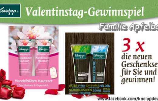Hallo meine Lieben, die Firma Kneipp, hat für Euch, ein Valentins-Gewinnspiel eröffnet. Was ihr gewinnen könnt ? 3x Mal die neuen Geschenksets für Sie und Ihn. Wenn ihr Mitglied bei Facebook seid, dürft ihr Euch hier registieren: Kneipp-Va [...]