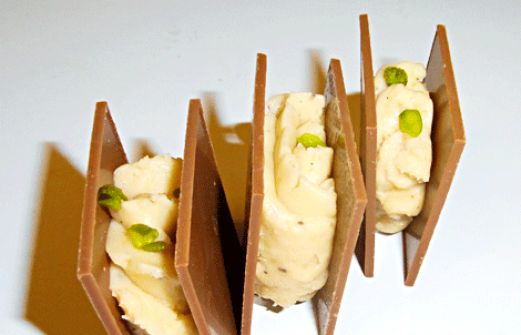 Vor kurzem hatte ich Erdnusstrüffel in Schokoblätter zubereitet. Ich wollte das ganze nochmals mit weißer Schokolade wiederholen. Diesmal spritze ich sie auf Schokotäfelchen und den Rest der Schokoblätter. Daraus wurden leckere, rasche und dekorative Pralinen.