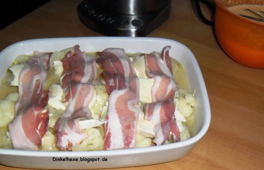 Blumenkohlröschen leicht vorgaren. Für die helle Soße: Einen Esslöffel Butter zerlassen einen Esslöffel Mehl zufügen und glattrühren. Sobald sich eine weiße Schicht am Topfboden bildet wird mit 150 ml Sahne bzw. Milch und 150 ml Blumenkohl-Brühe abgelöscht. Zu einer glatten Soße rühren. M [...]