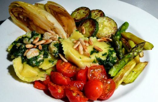 Die handgemachten Basilikum-Ravioli stammen aus dem Hause „ Casa de la Pasta “ in Mannheim, R 7, 29.