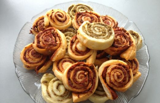 Zutaten: 2 Packungen Blätterteig 2 Gläser entsteinte Oliven Pfeffer Salz Kürbiskernöl 2 Gläser getrocknete Tomaten in Öl Pfeffer Salz Paprikapulver Chilli Sonnenblumenkerne Den Backofen auf 200 Grad vorheizen. Den Blätterteig ausbreiten. Dann die Oliven angießen und zusammen mit dem Pfeffer, Sa [...]