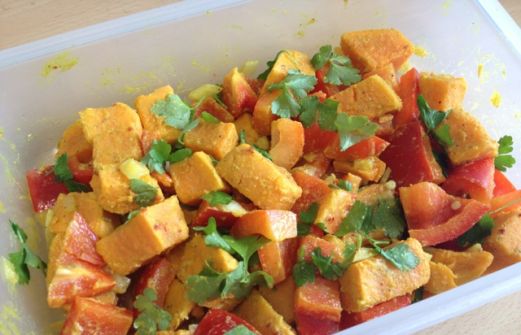 Zutaten: (für etwa 1 Portion) 1-2 Süßkartoffeln (je nach Größe) 1 1/2 Paprikaschoten 1 kleine Zwiebel 1 Msp. Chiliflocken 1 Msp. Cayennepfeffer 1 TL Senf 1,5 EL Apfelessig 1 EL Oliven- oder Nussöl 1 Sprizer Zitronensaft 1/4 Bund Petersilie ½ TL Kurkuma ½ TL Currypulver Salz Pfef [...]