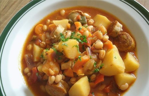 Ein leckeres Kartoffelgulasch mit Wurstscheiben, der mit weißen Bohnen verlängert, als Eintopfgericht glänzt und den man immer wieder mal gerne auf den Tisch bringt.