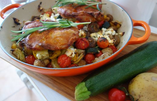 Draussen regnet es, also haben wir uns heute Mittag die Sonne auf den Teller geholt! Dank einiger Reste aus dem gestrigen Kochkurs hatten wir eine bunte Gemüsevielfalt im Ofen, die ich mit Kartoffeln, Ziegenfrischkäse und entbeinten Hähnchenkeulen aufgepeppt habe. Die frischen Kräuter tun ihr ü [...]
