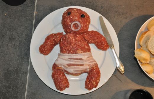 Und noch ein weiteres Spaß-"Rezept" was ich nicht vorenthalten möchte... Seit Jahren geistert im Internet der Mythos des Mett-Baby umher. Wenn man es sucht erhält man leider nur ein qualitativ schlechtes Bild. Grund genug endlich ein solches nachzubilden. Einkaufs-/Zutatenliste: 1kg Mett (f [...]