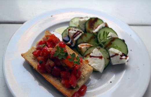 Für die Bruschetta werden die Tomaten entkernt, fein würfeln und in eine Schüssel gegeben. Für die Marinade werden frische Krä [...]