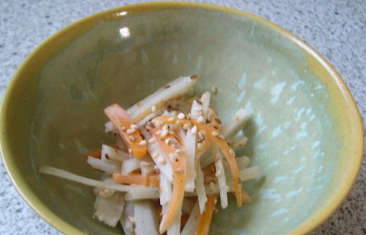In japanisch " ごぼう の サラダ ". Gobō findet man auch unter dem Namen Klettwurzel und wird im Asiamarkt als ziemlich lange Wurzel verkauft. Meine fast einen Meter lang. Der Kilopreis lag bei 2,99€. Es ist ein Wurzelgemüse, welches mit Schale aber auch ohne gegessen werden kann und daher sehr b [...]